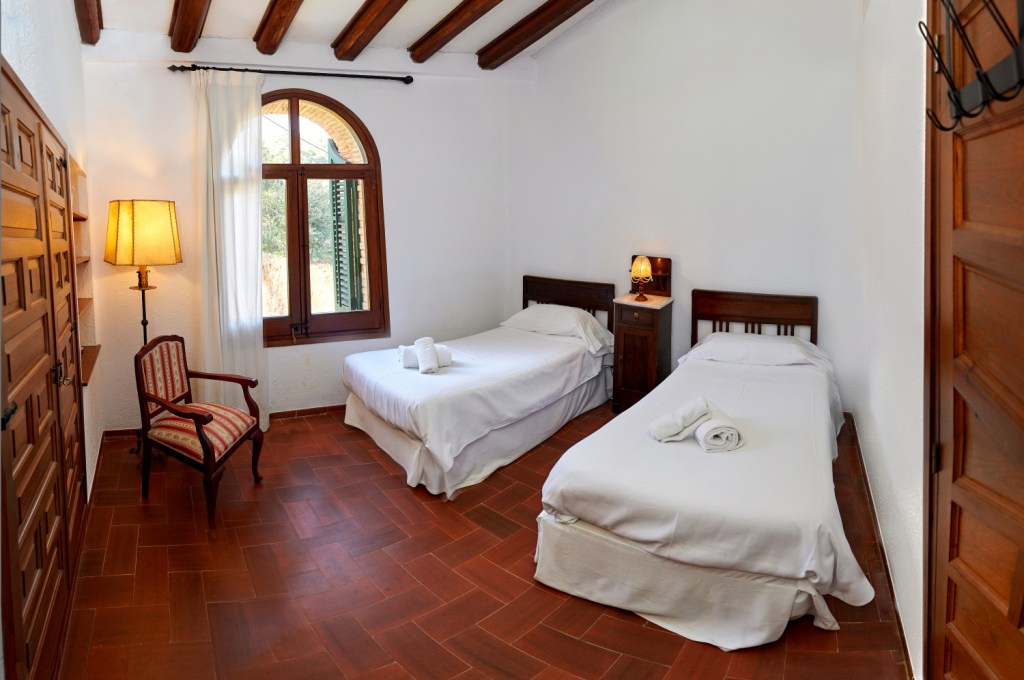A la planta superior de la casa hi ha sis habitacions dobles (tres de matrimoni), una habitació individual, dos banys complets i un lavabo de cortesia. Al centre d’aquesta planta hi ha una gran sala central, típica de les grans masies, que pot ser utilitzada com a sala d’estar i com a menjador en ocasions de festes especials.